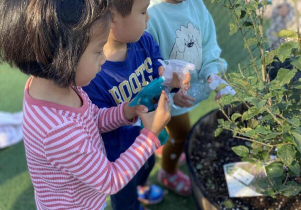 Another photo shows the children engaging in sensory activities. The educators created an unhealthy park area and the children used different tools to clean up the garbage and trash from the park area.