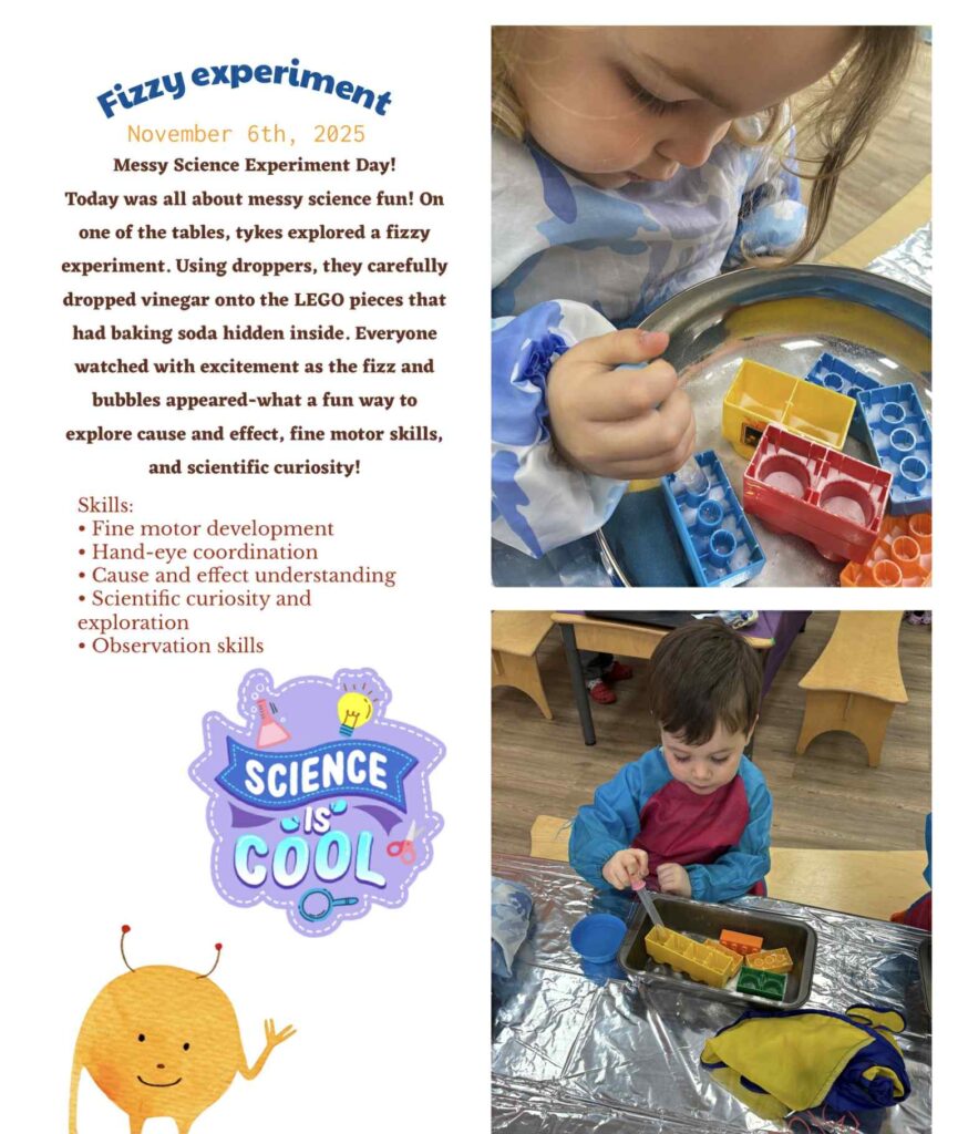 Messy Science Experiment Day! Today was all about messy science fun! On one of the tables, tykes explored a fizzy experiment. Using droppers, they carefully dropped vinegar onto the LEGO pieces…