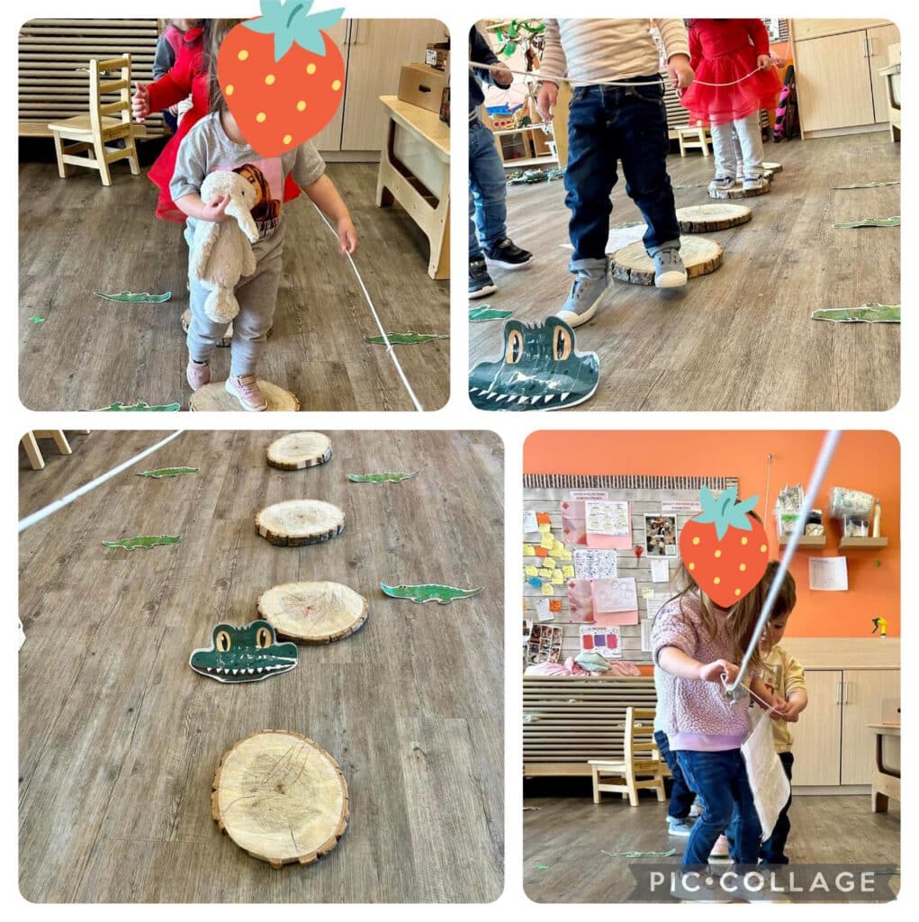 Our older tots have explored the anticipation of crossing the slack bridge near the alligator. Fostering in physical health to overcome fears of being brave enough to cross the slack bridge….