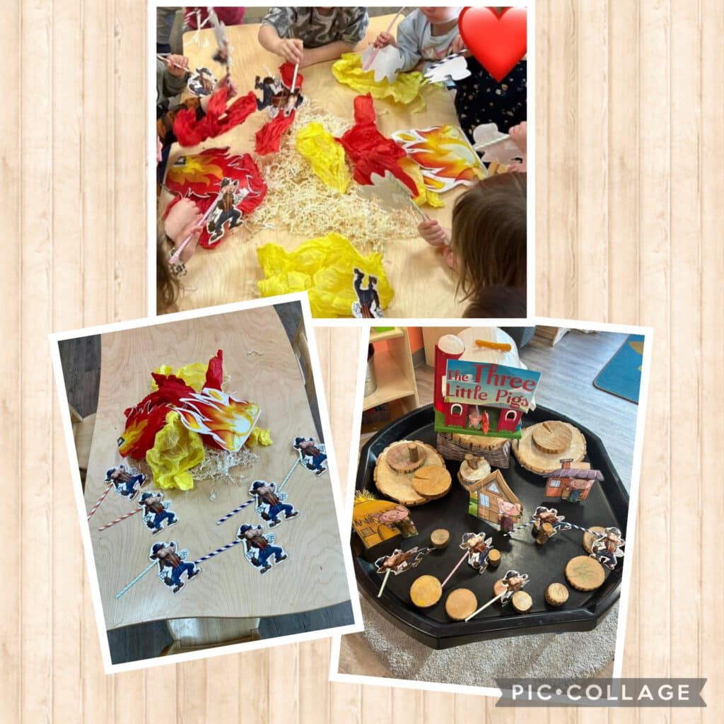 Bringing story to life, children experience to be a pretend wolf in the three little pigs dramatic activity, blowing down the pigs house using straw fostering control and coordination. Blowing the…