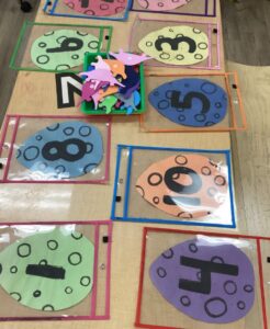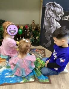 One of our Preschool classrooms was transformed into a prehistoric wonderland filled with dinosaurs. This allowed for play-based learning through volcano sensory play and a fun volcano science experiment! Also, the children had fun rescuing dinosaurs and bringing them to life through dramatic play. The preschoolers enjoyed applying math skills by counting dinosaurs and using geometric shapes to build dinosaur patterns!