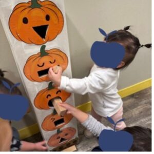 Children in the Tykes classes became scientists as they learned new terms and made theories and predictions about their pumpkin explorations. They examined pumpkins to learn about their parts and made predictions before opening them. They had conversations with questions such as “What will it look like inside? How many seeds are inside? How does a pumpkin grow?” In art, the children created their own standing spiders, learning about the legs of a spider and how it walks. They also built their own scarecrows, recognizing how much straw is needed to make their own scarecrow