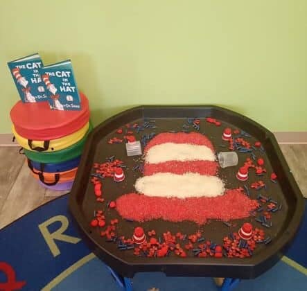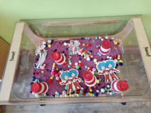 We loved celebrating Dr. Seuss’s birthday with some fun activities. In the sensory bin and tuff tray we loved exploring the Cat in the Hat through sensory. We could scoop, pour, bury, feel all the different items and textures. They loved working on their numerency skills at the light table as well as their fine motor by counting the fish and puttting them together. We also had a garden for Dr. Seuss where he could grow his vegetables and feed the animals. The children love exploring all the different textures and sensory items.