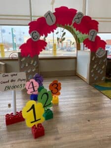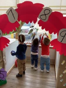 Day 2 of Dr. Seuss week! Today we read *“One, Two, Three”*. Our tiny tots enjoyed exciting activities of counting and picking “bloogs” from the puffy pink tree, colouring stickle-bush trees, exploring letters and candles, and driving funny fish cars along the track on the tuff tray. Through these hands-on experiences, they developed early numeracy and literacy skills, strengthened their fine motor control, enhanced hand–eye coordination, encouraged creativity, and built social skills through shared play and exploration with their friends. on, focus, and creativity.