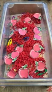 This morning, our toddlers enjoyed fun activities inspired by *Ten Apples Up on Top* by Dr. Seuss. We listened to the story and explored stacking and counting through apple picking and basket collecting, using tweezers to gather apples in the tuff tray, sticking apples on top of a lion, tiger, and dog, and dabbing paintsticks on counting worksheets. These activities supported fine motor skills, hand-eye coordination, counting skills, number recognition, focus, and creativity. Happy Tuesday!