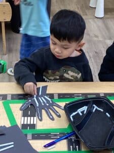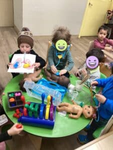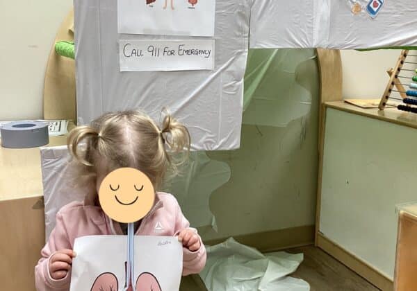 One of our Preschool age groups turned their classroom into a hospital! These future doctors were enjoying dramatic play, giving checkups, using stethoscopes, and helping their “patients” feel better. They also enjoyed learning what their bodies can do by using balloons and straws – the children were fascinated to see how the balloons inflated and deflated. They also made “Macaroni brains” – gluing pasta onto brain outlines to see how the brain looks and to talk about how it helps us think and learn and “Hand X-ray skeletons” – tracing their hands and adding “bones” using straw pieces to understand what’s inside our bodies.