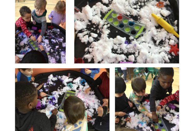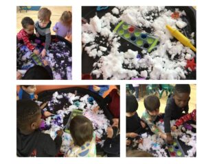 Mixing paint with water introduced early science and math concepts, such as cause and effect, color mixing, and noticing changes in texture and flow into the snow. Children were fascinated by how the colors spread, blended, and moved across it, making the experience both visually exciting and calming. The tuff tray allowed plenty of space for experimentation, collaboration, and shared discovery, encouraging social interaction and language as children talked about their ideas and observations.