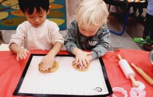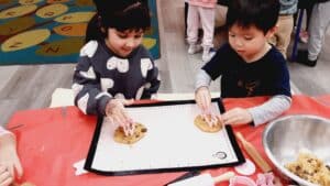 In preparation for Thanksgiving, our JK2 class showed interest in pumpkins and turkey. To extend their interests, teachers arranged a “pre-thanksgiving” lunch complete with homemade pumpkin cookies! Our friends learned how to make the tasty treats by watching the teachers add the ingredients to a mixer and making the dough. Everybody got a chance to make their own cookies by molding and cutting them to their desired shapes. After baking, they ate it as an afternoon snack and shared it with friends in the other classrooms. It was a perfect way to show thanks and gratefulness to one another!