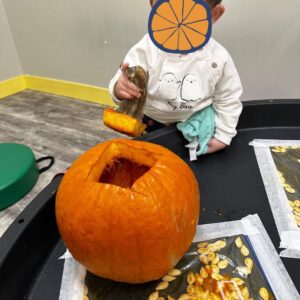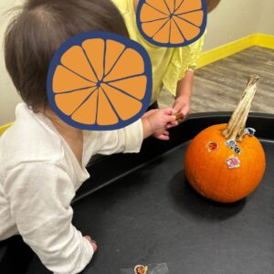 Our children in the Squirts classes explored the season through sensory play! They discovered new things about the pumpkins using their senses. Teachers helped describe what they noticed, building early language skills with words like big, small, hard, and round. They also began learning how to use different art materials by painting on the pumpkin with different sponges and brushes.