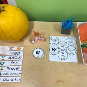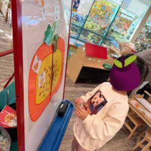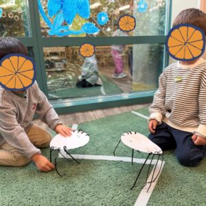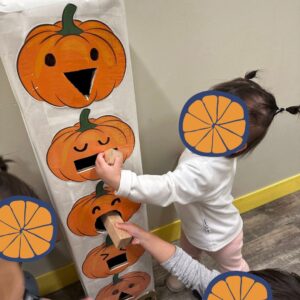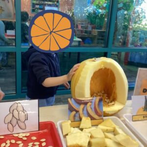 Children in the Tykes classes became scientists as they learned new terms and made theories and predictions about their pumpkin explorations. They examined pumpkins to learn about their parts and made predictions before opening them. They had conversations with questions such as “What will it look like inside? How many seeds are inside? How does a pumpkin grow?” In art, the children created their own standing spiders, learning about the legs of a spider and how it walks. They also built their own scarecrows, recognizing how much straw is needed to make their own scarecrow.