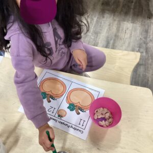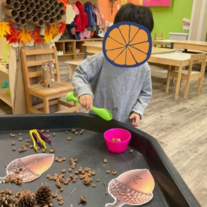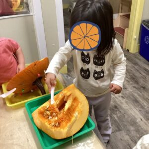 Children in the Tots classes took their pumpkin learning to the next level! After painting and decorating their pumpkins, they got to see what was inside one. Together, they scooped out the seeds and explored the pulp using tools like magnifying glasses. Teachers guided them to describe what they felt and saw, introducing new vocabulary like slimy, smooth, and seeds.