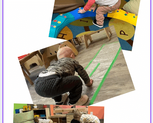 As the squirts navigate through this active environment they are benefitting from balancing skills, full body exploration and sensory stimulation. Squirts are looking for the sensory outputs in both tactile touch and moving their bodies over. The children are emerging there own understanding of what risks they feel comfortable with. Educators in the class modeled how to maneuver through this sensory walk. Some of us got distracted with the popping sounds that are happening under our feet. The expressions on the children’s faces tells us a story about how they felt in this experience they kept returning back to this responsive space.