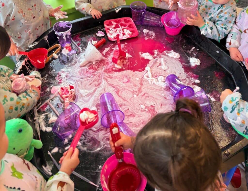 Our toddlers participated in a variety of Valentine’s Day sensory exploration in the tuff tray, focusing on mixing, pouring, and scooping materials. This experience supported fine motor…