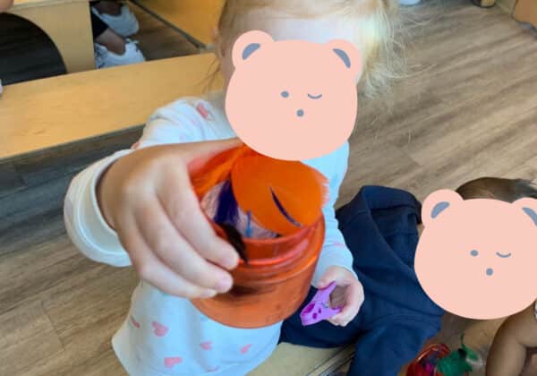 Another day we were working on our creativity, sensory and fine motor skills. Today, the teacher set up the table with feathers, cloth pins and cups for free exploration. Playing, they also practice their social, colour recognition and language skills.He is using two cloth pins to get feathers from the sensory binShe is using her hands and a cloth pin to get feathers.He is using his thumb on top and the rest of his fingers on the bottom of the cloth pin to get feathersShe is very proud of herself for getting so many feathers