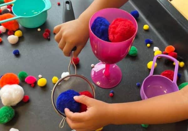 Our friends loved to play with our pom pom activity last time so we brought it out again and put some new tools in to explore pouring, filling, and transferring